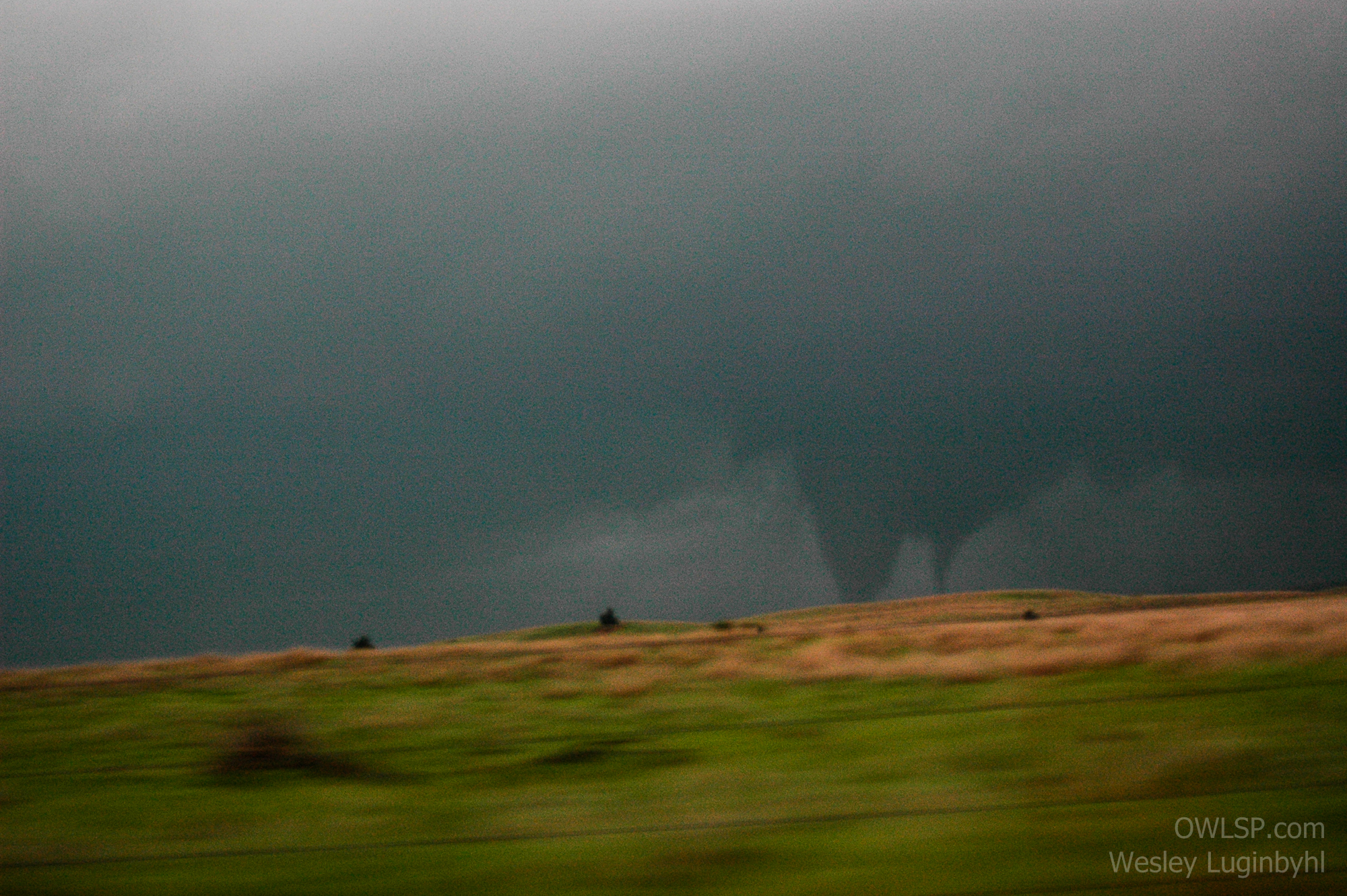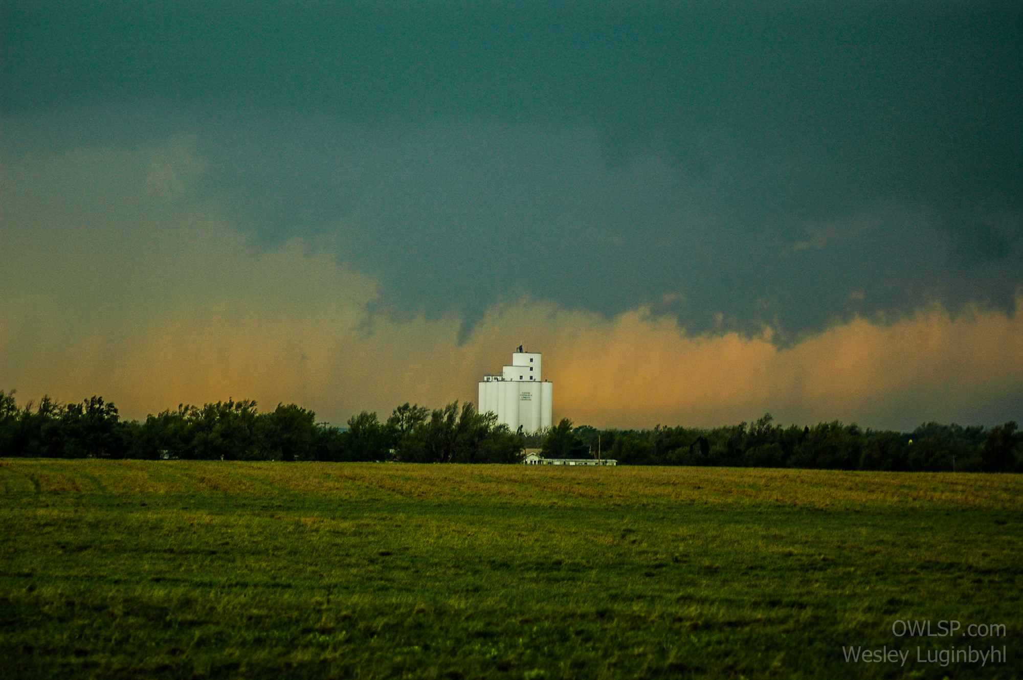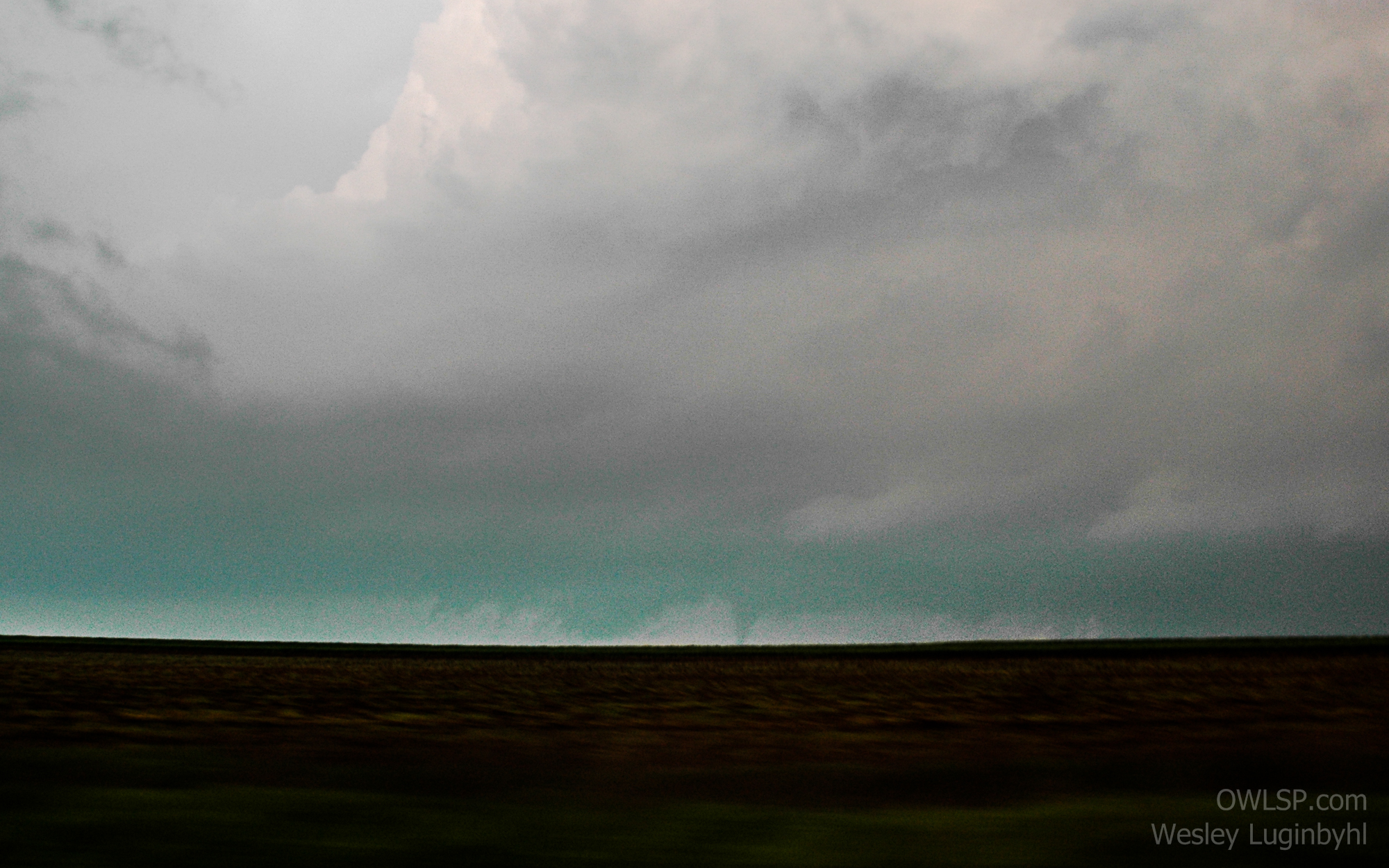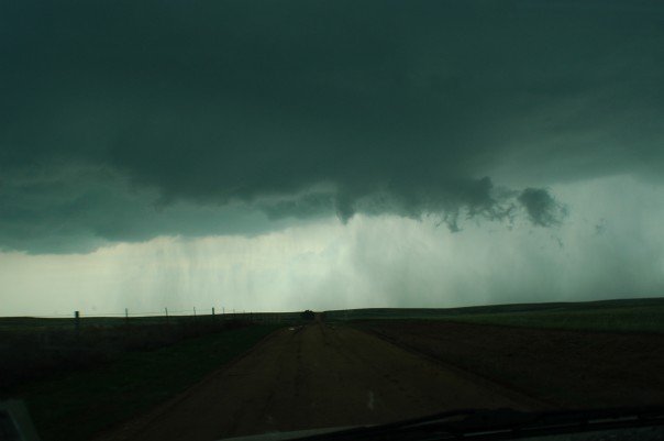 After 30 mins in Woodward a new cell went up in the Panhandles west of Buffalo, so we jumped back on the highway to intercept them. As we went into KS, I went down a dirt road trying to head east that was not too bad, but that changed though. After making it through a gate we came across a large stretch of the road that went through a valley... of all mud. So we turned around to see a small wall cloud with weak rotation coming right at us (1). I figured it was best to drive under before it got any more organized. It gusted out as we drove under it. We then stayed on paved roads and got back in front of it at Protection, just in time to see decent rotation pass north of the city and hear the sirens go off.