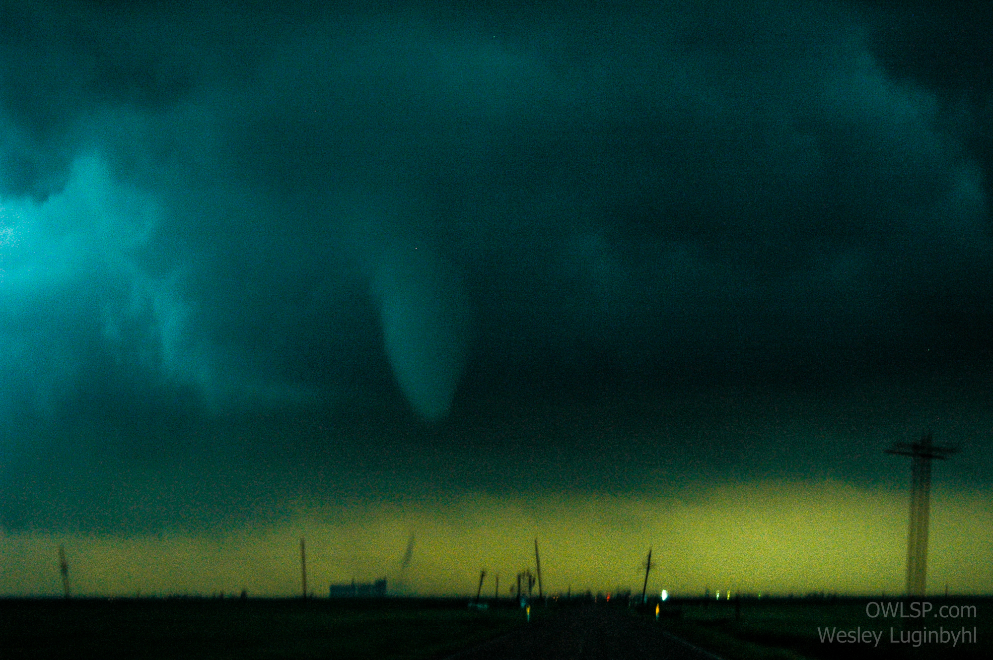 We caught back up with the area of circulation on NW 110th and drove east and took Dillwyn road north. We could see the large tornado on the ground near Macksville as we approached traveled north (7)(8). We passed through one road block, but not really noticing it because someone had moved it off the road. We then came across another road block that was still in place. Though there was room to get around I didn't really want to go through it, but after looking at how muddy every road was it was our only option to continue the chase.The day was over if we didn't go around the roadblock, so the choice was easy at this point. I figure there would be powerlines across the road or something for them to have blocked the road, so i took it pretty slow down the road and turned on my flasher. A larger group of other chasers came speeding down the road behind me after I went through the roadblock. There was miles of power poles laid down next to the road. The large Macksville tornado was still on the ground at this point, but we got distracted by a new funnel dropping down directly in front of about a mile down the road (9). Some people started to try and pass me, because I was driving pretty slow. I was going slow because of poor visibility (low light) and I didn't know what could be blocking the road ahead, not to mention the tornado in front of us. As we passed a small substation with some guys doing repairs there, I noticed powerlines laying across the road but it was way too late to try and stop with the people on my bumper. I tried to slow down what I could, but we crossed over them no problem. The chasers who were taking their sweet time to pass me slowed backed down and got inline behind me again. The rope funnel in front of us lasted a good couple minutes and was very breathtaking (10). It had a very nice debris cloud which I think just about hit some people sitting on highway 50 when it first came down.